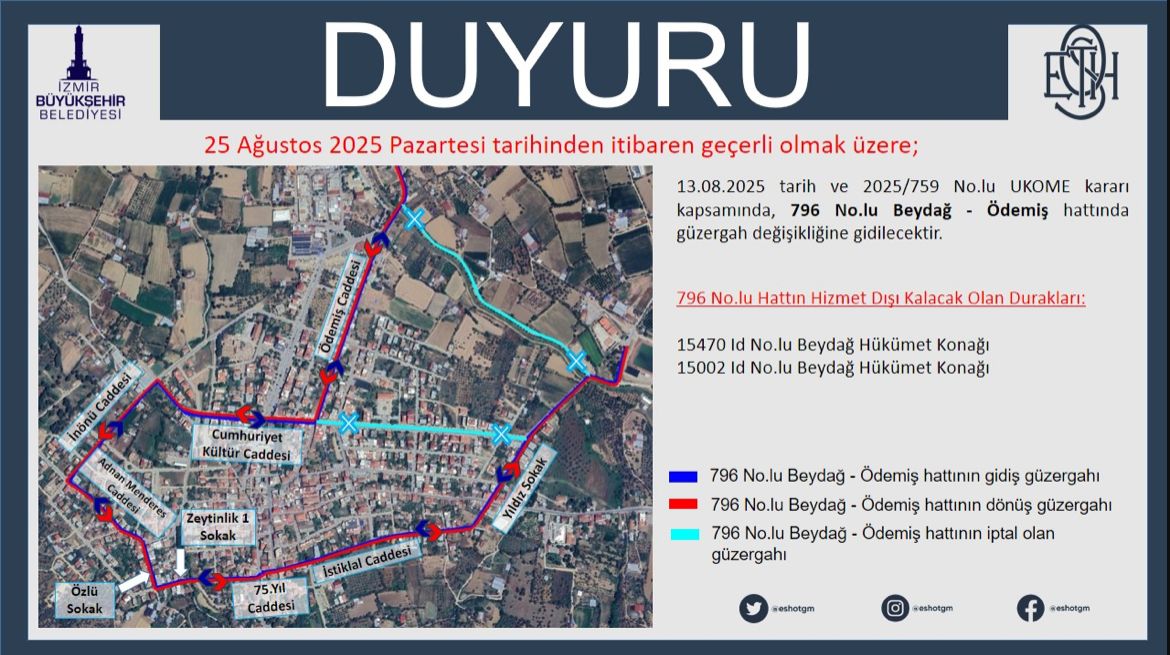 İzmir Büyükşehir Belediyesi, 796 numaralı Beydağ – Ödemiş otobüs hattında güzergâh değişikliğine gidileceğini duyurdu. UKOME’nin…