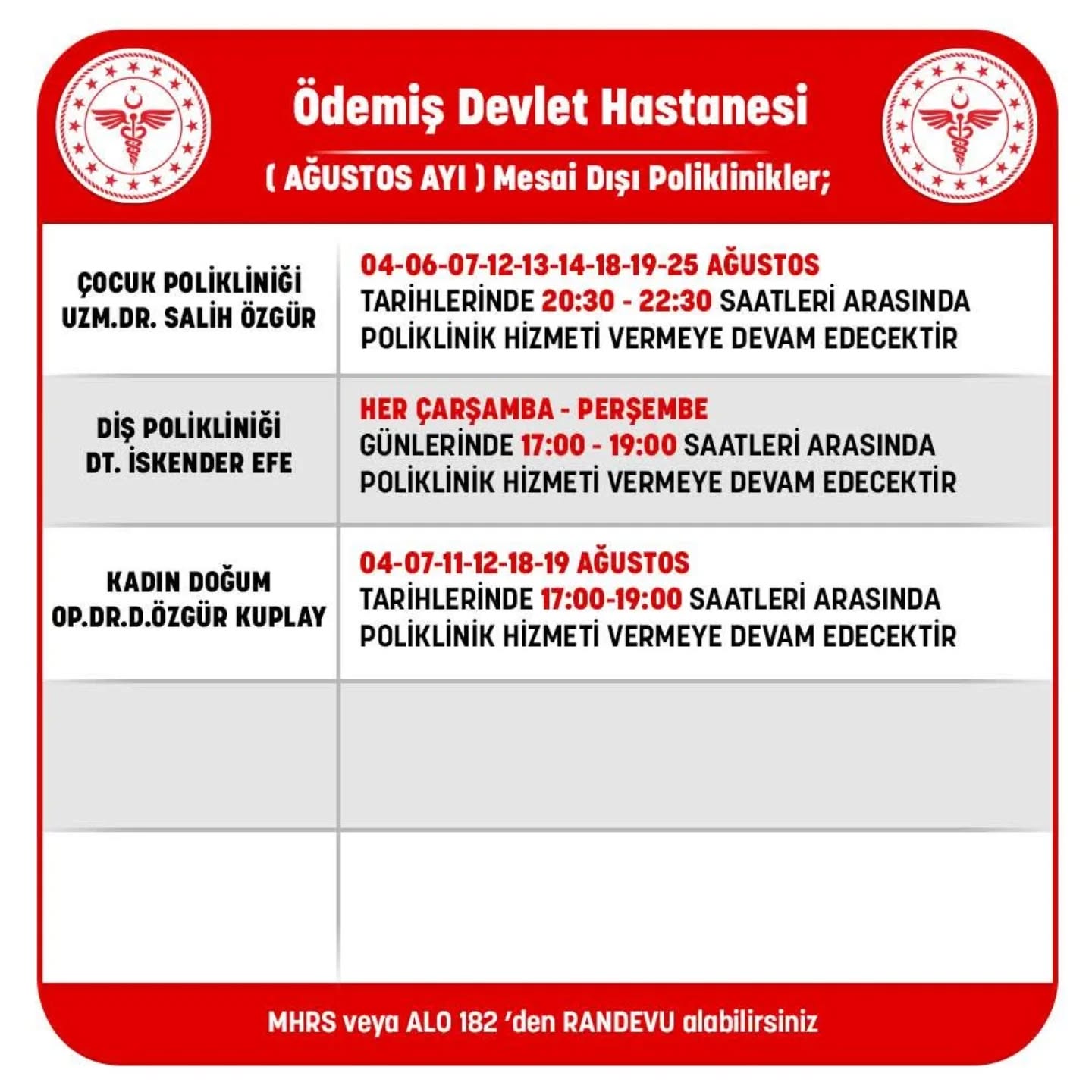 Ödemiş Devlet Hastanesi, vatandaşların sağlık hizmetlerine daha kolay ulaşabilmesi için Ağustos ayı boyunca mesai saatleri dışında da poliklinik hizmeti sunmaya devam ediyor. Belirli gün ve saatlerde görev yapacak uzman hekimler, farklı branşlarda hasta kabulüne açık olacak.