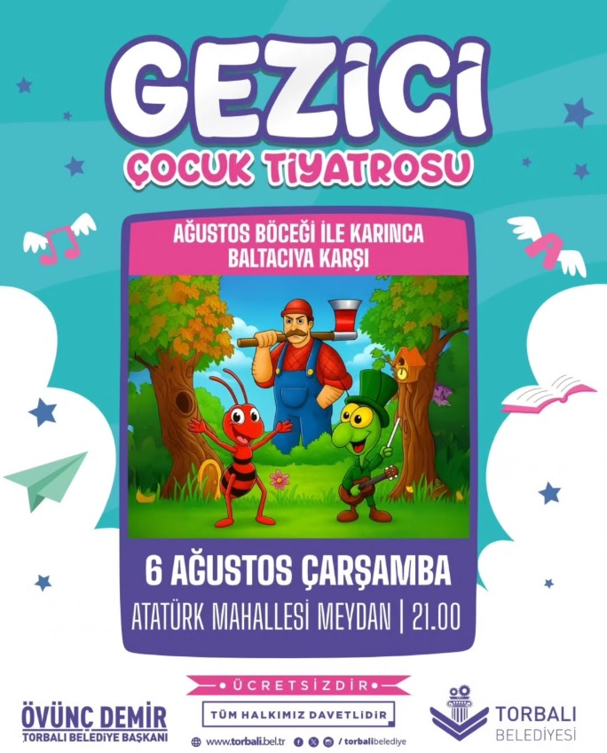 Torbalı Belediyesi, yaz boyunca çocuklara yönelik etkinliklerle neşe dolu anlar yaşatmaya devam ediyor. Bu kapsamda hazırlanan programın bir parçası olarak, “Ağustos Böceği ile Karınca Baltacıya Karşı” adlı çocuk tiyatrosu 06 Ağustos Çarşamba günü saat 21.00’de, Atatürk Mahallesi Meydanı’nda sahnelenecek.